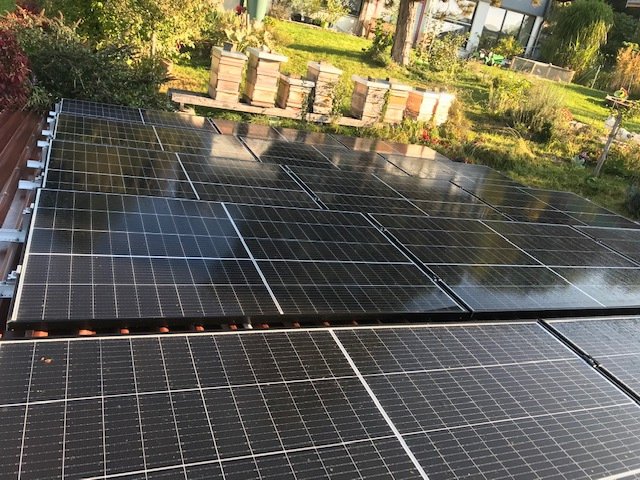 12 Module je 340W auf der Westseite sowie 12 baugleiche Module auf der Ostseite. Leistungsverlust durch Beschattung wird an einer Stelle, durch den Einsatz von Optimierern, umgangen.